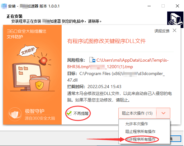 3. 如仍有误报画面,也同样勾选「允许程序所有操作」,以及勾选「不再提醒」,即可顺利完成安装