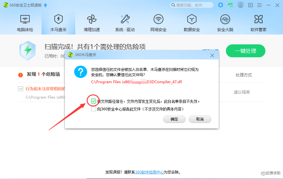3. 勾选「按文件路径信任...」,然后按下「确定」,并取消下方[向360安全中心报告此文件]勾选项